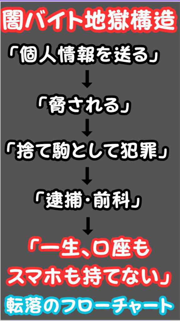 - 特徴:どれも**「簡単」「在宅可」**と謳い、気づいたら犯罪収益移転防止法違反や著作権法違反に